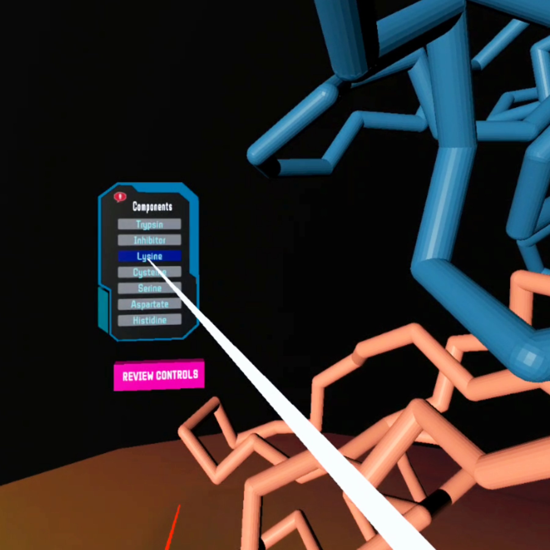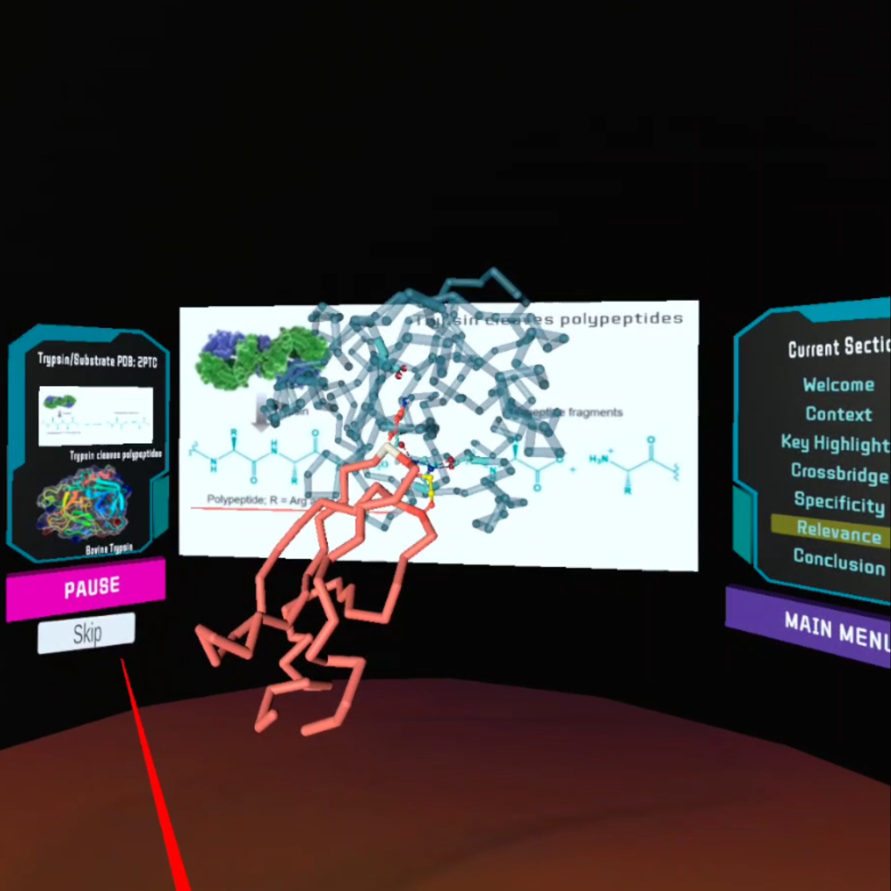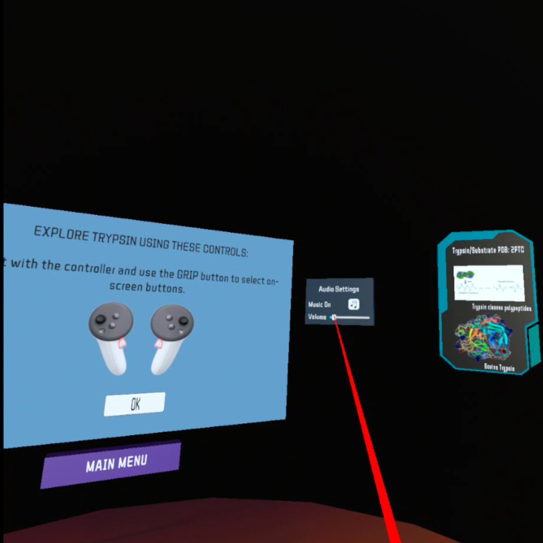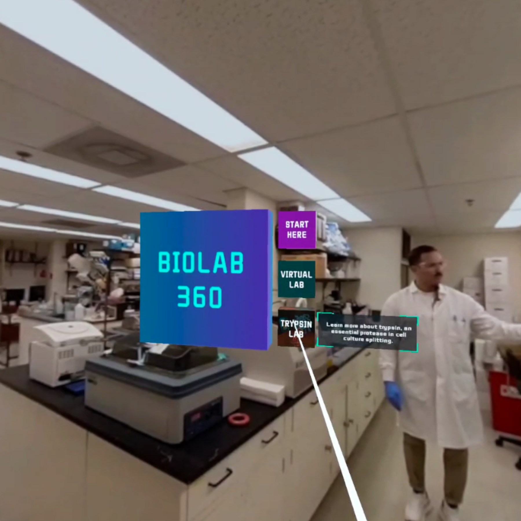 BioLab 360 is an immersive VR training experience for the life sciences. Poor technique and accidents in the lab cause waste and are dangerous. BioLab360's step-by-step training in cell culture procedure and centrifuge technique can limit waste and enhance safety by improving the comfort of students or lab technicians embarking on a biotechnology career. The use of 360-degree and point-of-view video immerses learners. Trainees can interact with a 3D model of trypsin bound to an inhibitor. An interactive in-experience knowledge quiz documents learning progress.